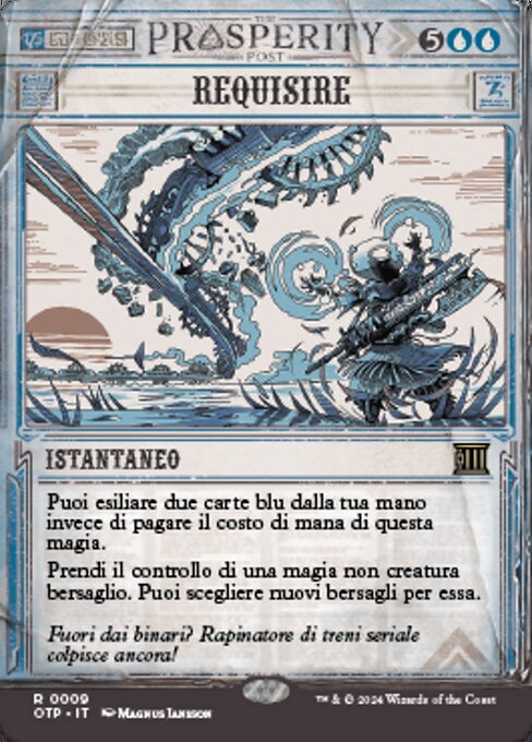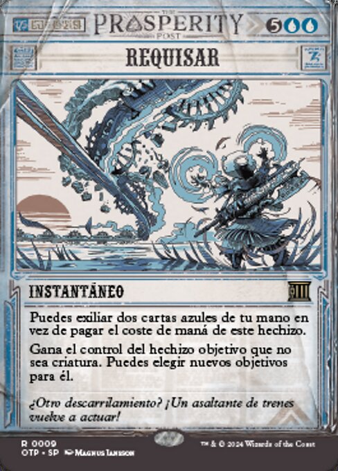 ![]() Variations— Parts— | RequisarPuedes exiliar dos cartas azules de tu mano en vez de pagar el coste de maná de este hechizo. Gana el control del hechizo objetivo que no sea criatura. Puedes elegir nuevos objetivos para él.