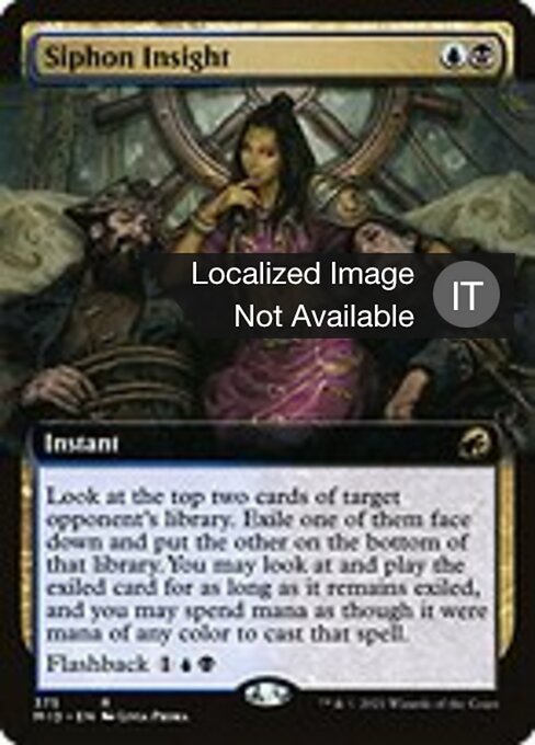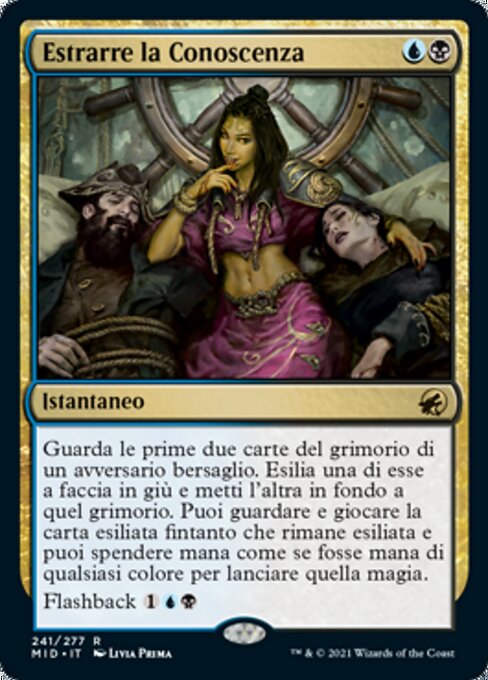 ![]() Variations— Parts— | Estrarre la ConoscenzaGuarda le prime due carte del grimorio di un avversario bersaglio. Esilia una di esse a faccia in giù e metti l'altra in fondo a quel grimorio. Puoi giocare la carta esiliata fintanto che rimane esiliata e puoi spendere mana come se fosse mana di qualsiasi colore per lanciare quella magia. Flashback
