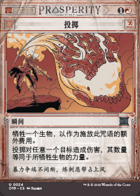|  Variations— Parts— | 投げ飛ばしこの呪文を唱えるための追加コストとして、クリーチャー1体を生け贄に捧げる。 1つを対象とする。投げ飛ばしはそれに、その生け贄に捧げたクリーチャーのパワーに等しい点数のダメージを与える。