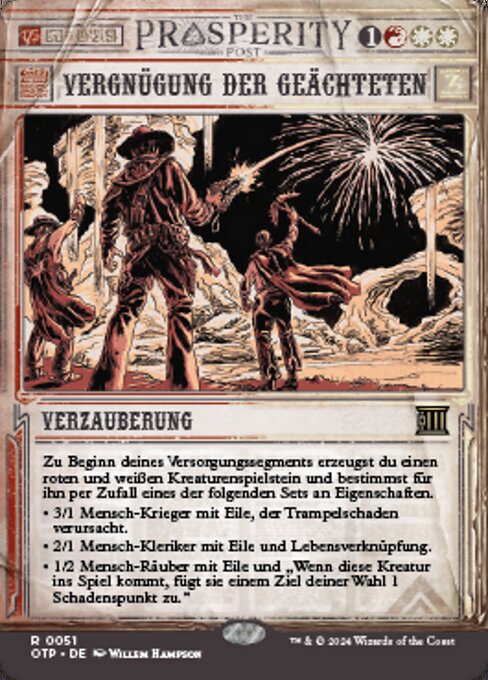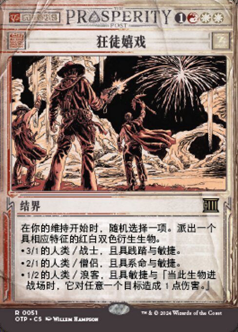 ![]() Variations— Parts— | 狂徒嬉戏在你的维持开始时,随机选择一项。派出一个具相应特征的红白双色衍生生物。 •3/1的人类/战士,且具践踏与敏捷。 •2/1的人类/僧侣,且具系命与敏捷。 •1/2的人类/浪客,且具敏捷与「当此生物进战场时,它对任意一个目标造成1点伤害。」