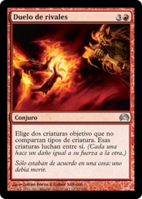 ![]() Variations— Parts— | Duello dei RivaliScegli due creature bersaglio che non condividono alcun tipo di creatura. Quelle creature lottano l'una con l'altra. (Ogni creatura infligge all'altra danno pari alla propria forza.)