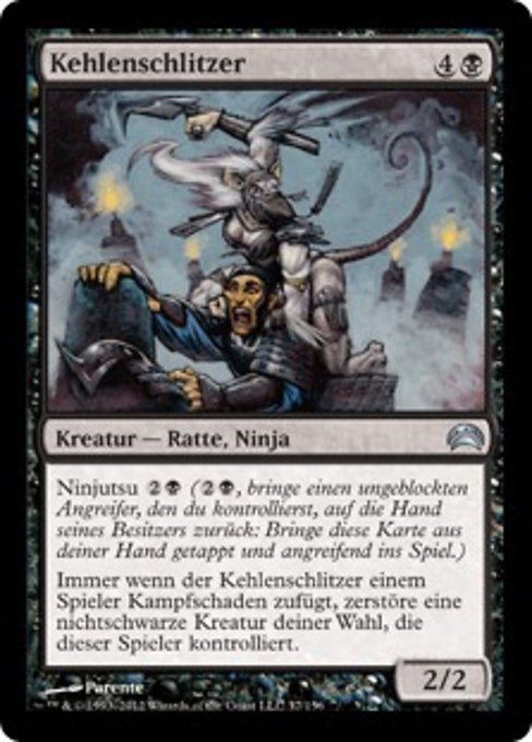 ![]() Variations— Parts— | 喉笛切り2 / 2 忍術 喉笛切りがいずれかのプレイヤーに戦闘ダメージを与えるたび、そのプレイヤーがコントロールする黒でないクリーチャー1体を対象とし、それを破壊する。