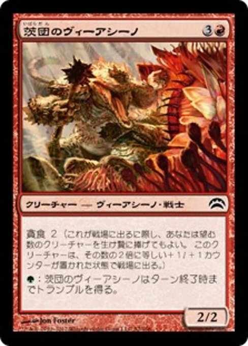 ![]() Variations— Parts— | 茨団のヴィーアシーノ2 / 2 貪食 2 (これが戦場に出るに際し、あなたは望む数のクリーチャーを生け贄に捧げてもよい。 このクリーチャーは、その数に等しい数の2倍に等しい+1/+1カウンターが置かれた状態で戦場に出る。)