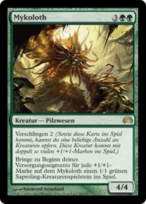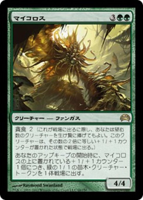 |  Variations— Parts— | マイコロス4 / 4 貪食 2 (これが戦場に出るに際し、あなたは望む数のクリーチャーを生け贄に捧げてもよい。 このクリーチャーは、その数に等しい数の2倍に等しい+1/+1カウンターが置かれた状態で戦場に出る。) あなたのアップキープの開始時に、マイコロスの上に置かれている+1/+1カウンター1個につき、緑の1/1の苗木・クリーチャー・トークンを1体戦場に出す。