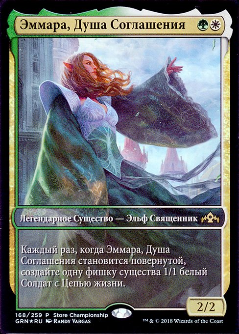 ![]() Variations : 1Parts— | Emmara, Soul of the Accord2 / 2 Whenever Emmara becomes tapped, create a 1/1 white Soldier creature token with lifelink.