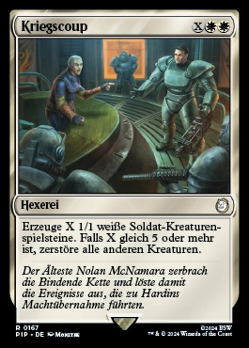 ![]() Variations : 3Parts : 2 | Martial CoupCreate X 1/1 white Soldier creature tokens. If X is 5 or more, destroy all other creatures.