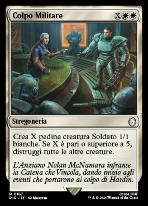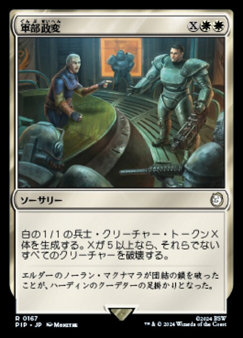 |  Variations : 3Parts : 2 | Martial CoupCreate X 1/1 white Soldier creature tokens. If X is 5 or more, destroy all other creatures.