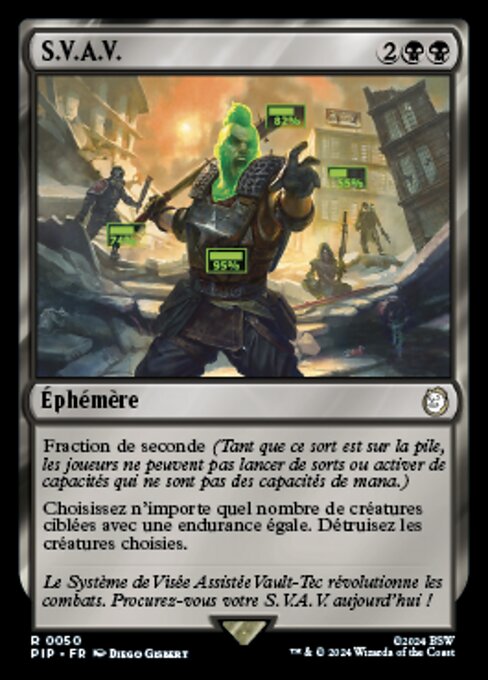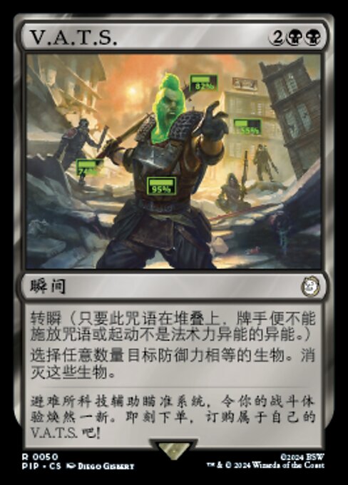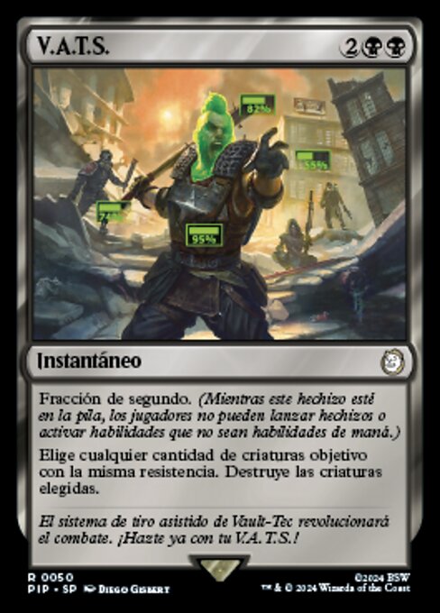 |  Variations : 3Parts— | V.A.T.S.Split second (As long as this spell is on the stack, players can't cast spells or activate abilities that aren't mana abilities.) Choose any number of target creatures with equal toughness. Destroy the chosen creatures.