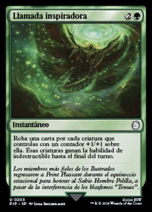 |  Variations— Parts— | Appel inspirateurPiochez une carte pour chaque créature que vous contrôlez avec un marqueur +1/+1 sur elle. Ces créatures acquièrent l'indestructible jusqu'à la fin du tour.