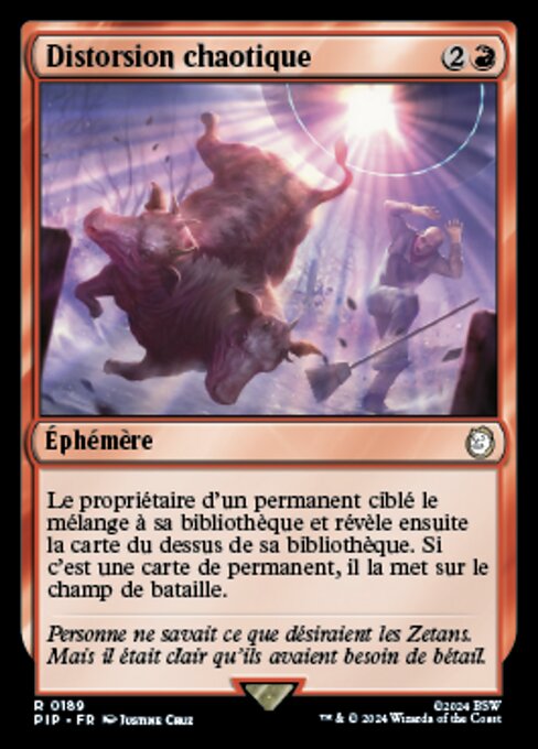 |  Variations— Parts— | Distorsione CaoticaIl proprietario di un permanente bersaglio lo rimescola nel suo grimorio, poi rivela la prima carta del suo grimorio. Se è una carta permanente, la mette sul campo di battaglia.