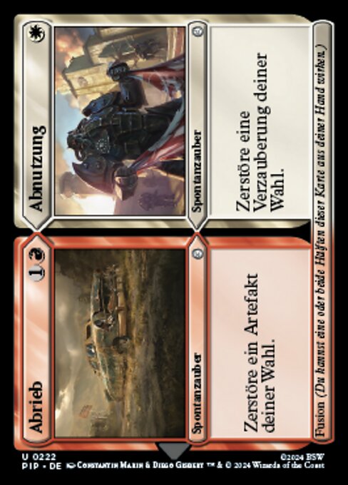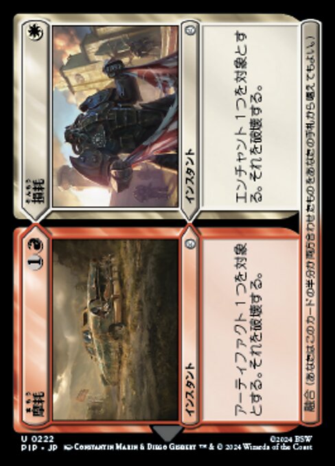 |  Variations— Parts— | Wear // TearDistruggi un artefatto bersaglio. Fusione (Puoi lanciare una o entrambe le metà di questa carta dalla tua mano.)