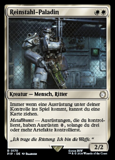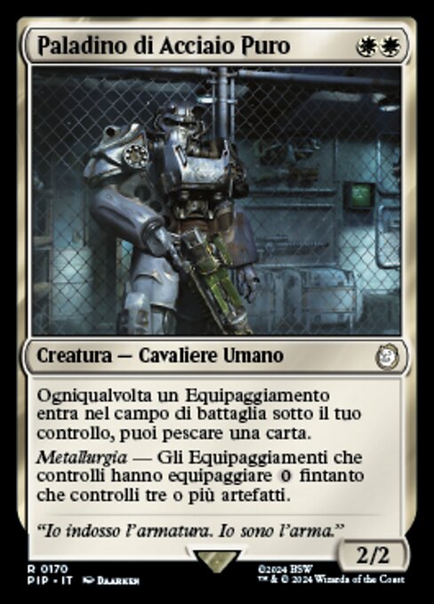 |  Variations : 1Parts— | 純鋼の聖騎士2 / 2 装備品1つがあなたのコントロール下で戦場に出るたび、カード1枚を引いてもよい。 金属術 ― あなたが3つ以上のアーティファクトをコントロールしているかぎり、あなたがコントロールしているすべての装備品は装備