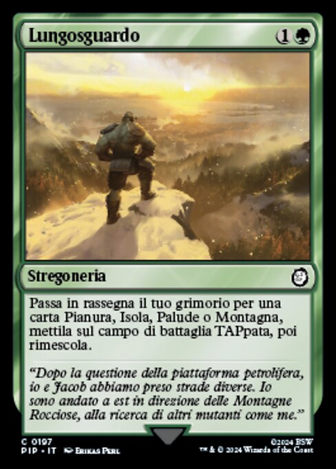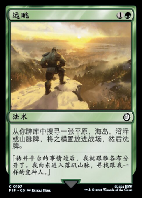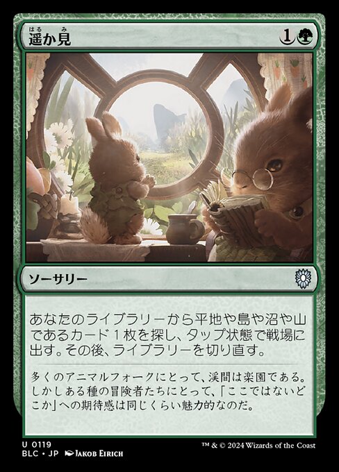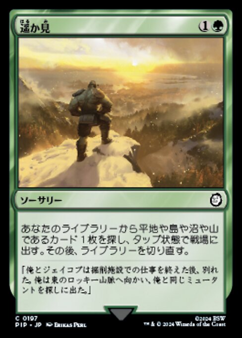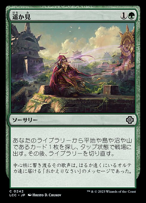 |  Variations— Parts— | 遥か見あなたのライブラリーから平地や島や沼や山であるカード1枚を探し、タップ状態で戦場に出す。その後、ライブラリーを切り直す。