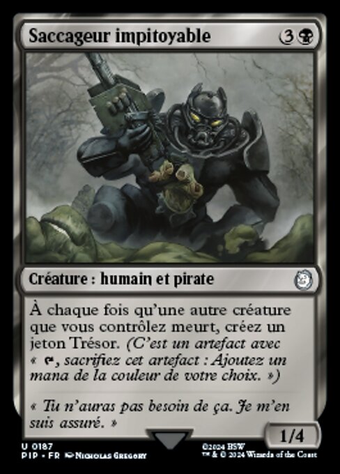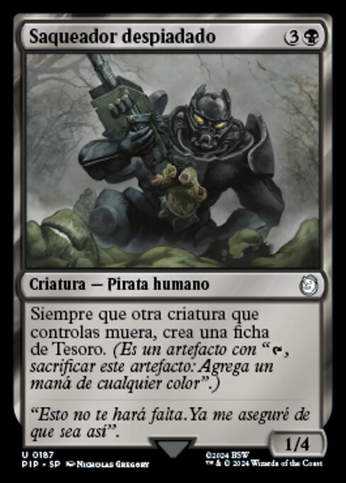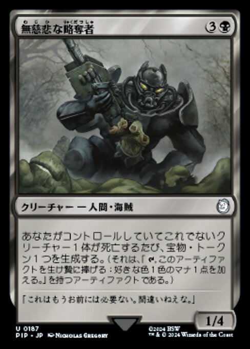 ![]() Variations— Parts— | 冷酷袭劫者1 / 4 每当另一个由你操控的生物死去时,派出一个珍宝衍生物。(它是具有「