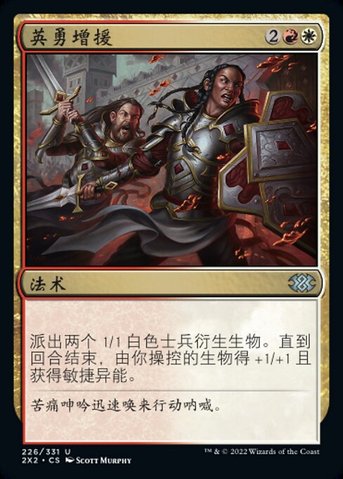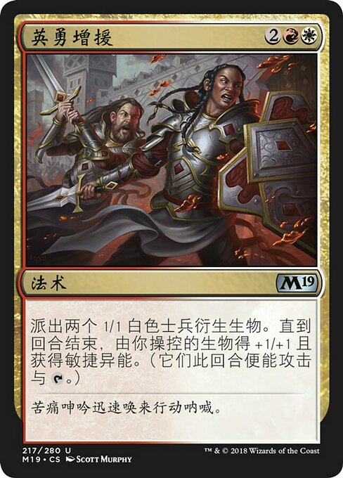 ![]() Variations— Parts— | 英勇增援派出两个1/1白色士兵衍生生物。直到回合结束,由你操控的生物得+1/+1且获得敏捷异能。