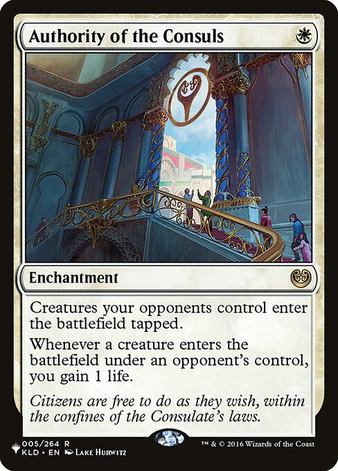 ![]() Variations : 1Parts— | Authority of the ConsulsCreatures your opponents control enter tapped. Whenever a creature an opponent controls enters, you gain 1 life.
