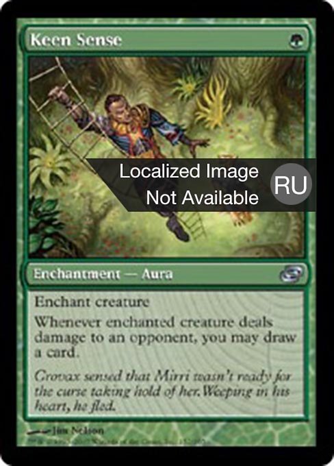 ![]() Variations— Parts— | Sentido entrenadoEncantar criatura. Siempre que la criatura encantada haga daño de combate a un oponente, puedes robar una carta.