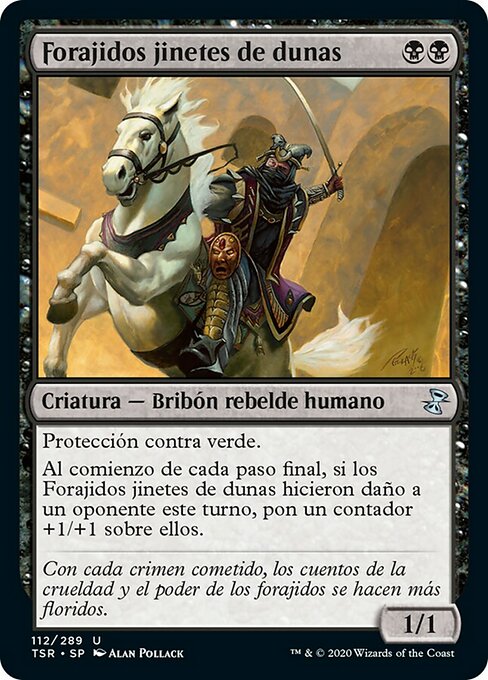 ![]() Variations— Parts— | Forajidos jinetes de dunas1 / 1 Protección contra verde. Al final del turno, si los Forajidos jinetes de dunas hicieron daño a un oponente este turno, pon un contador +1/+1 sobre ellos.