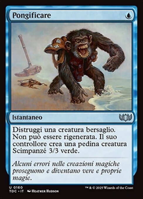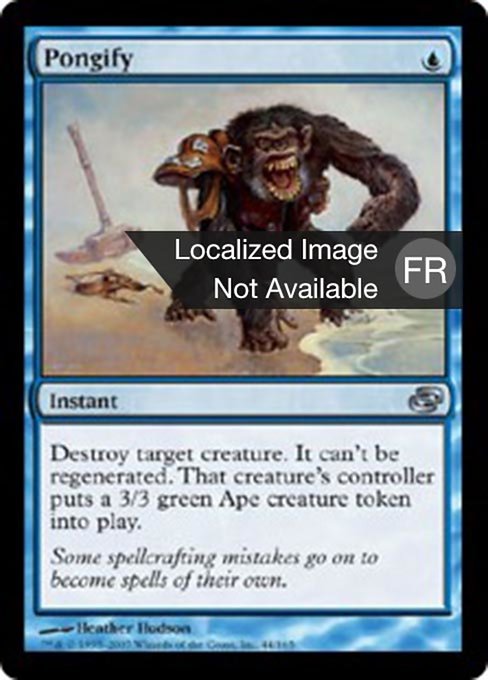 |  Variations— Parts— | PongificareDistruggi una creatura bersaglio. Non può essere rigenerata. Il controllore di quella creatura mette in gioco una pedina creatura Scimpanzé 3/3 verde.