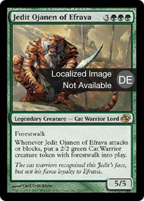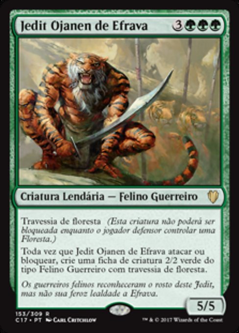 |  Variations— Parts— | Jedit Ojanen de Efrava5 / 5 Travessia de Floresta Toda vez que Jedit Ojanen de Efrava atacar ou bloquear, coloque em jogo uma ficha de criatura 2/2 verde do tipo Guerreiro Felino com travessia de floresta.