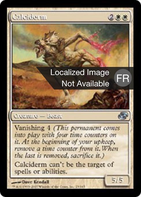 |  Variations— Parts— | Calciderme5 / 5 Desaparecer 4 (Esta permanente entra em jogo com quatro marcadores temporais sobre ela. No início de sua manutenção, remova um marcador temporal dela. Quando o último for removido, sacrifique-a.) Calciderme não pode ser alvo de mágicas ou habilidades.