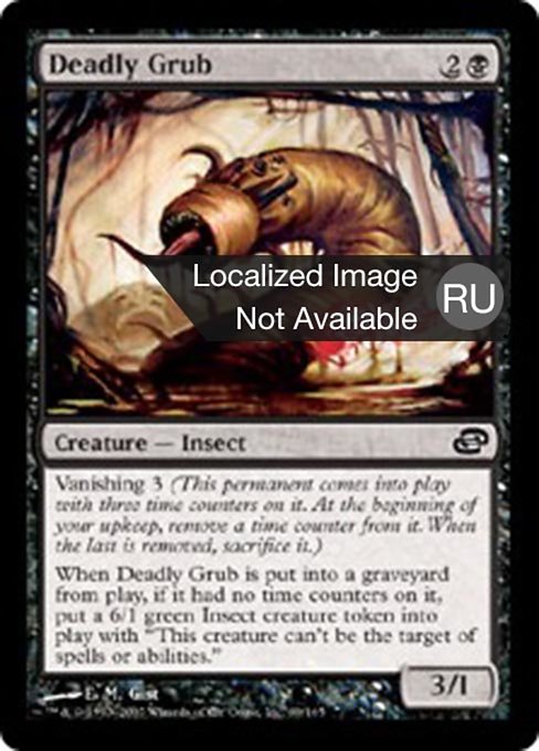 |  Variations— Parts— | Смертоносная Личинка3 / 1 Исчезновение 3 (Этот перманент входит в игру с тремя временными жетонами на нем. В начале вашего шага поддержки удалите с него временной жетон. Когда удален последний, пожертвуйте его.) Когда Смертоносная Личинка попадает на кладбище из игры, если она не имела временных жетонов на ней, положите в игру фишку существа 6/1 зеленое Насекомое со свойством «Это существо не может быть целью заклинаний или способностей».