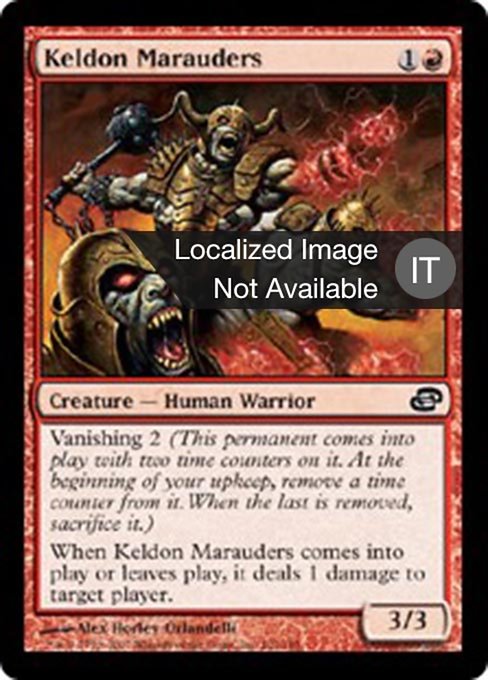 |  Variations— Parts— | 凯尔顿劫掠者3 / 3 消逝2(此生物进场时上面有两个计时指示物。 在你的维持开始时,从其上移去一个计时指示物。 当移去最后一个时,将它牺牲。) 当凯尔顿劫掠者进场或离场时,它对目标牌手造成1点伤害。
