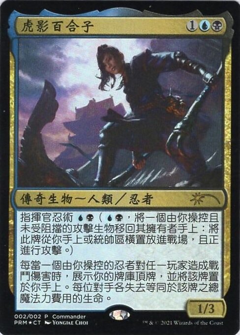 ![]() Variations— Parts— | Yuriko, the Tiger's Shadow1 / 3 Commander ninjutsu Whenever a Ninja you control deals combat damage to a player, reveal the top card of your library and put that card into your hand. Each opponent loses life equal to that card's mana value.