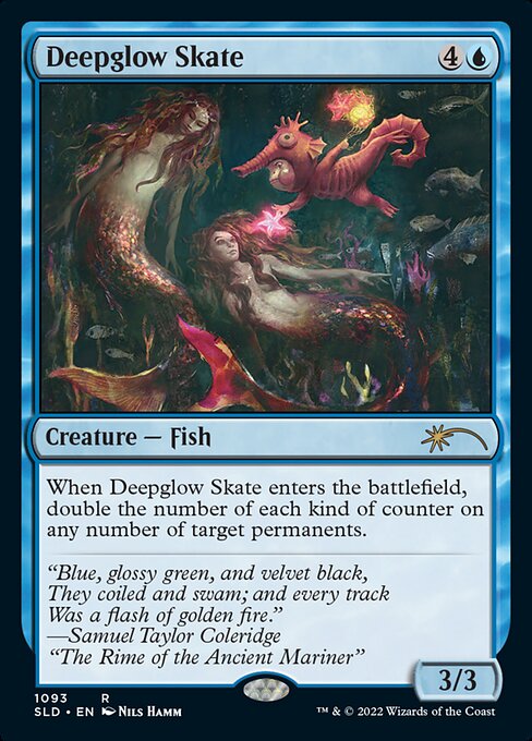 ![]() Variations— Parts— | Deepglow Skate3 / 3 When this creature enters, double the number of each kind of counter on any number of target permanents.