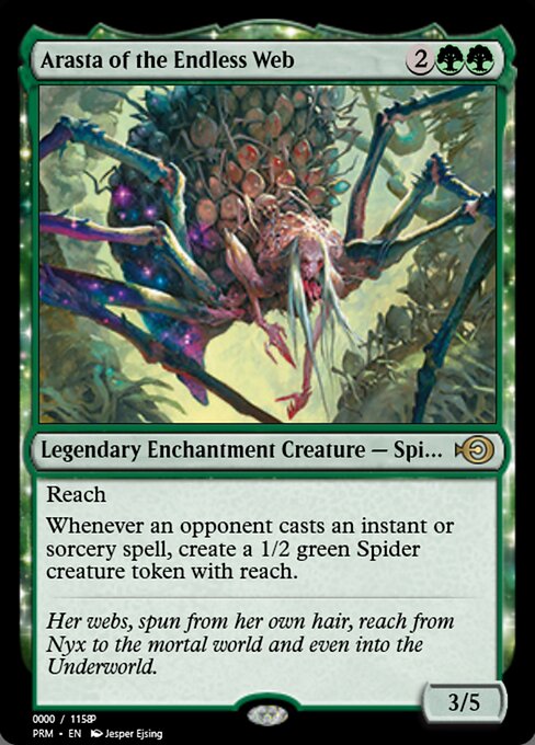|  Variations : 1Parts : 2 | Arasta of the Endless Web3 / 5 Reach Whenever an opponent casts an instant or sorcery spell, create a 1/2 green Spider creature token with reach.