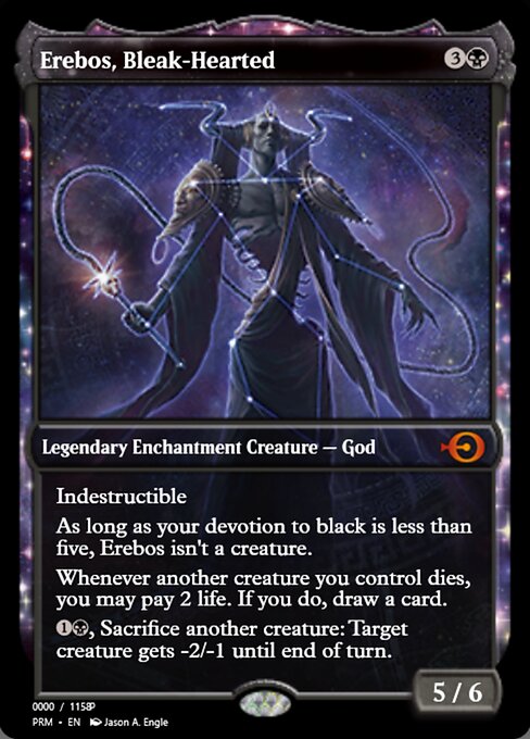 ![]() Variations : 1Parts— | Erebos, Bleak-Hearted5 / 6 Indestructible As long as your devotion to black is less than five, Erebos isn't a creature. Whenever another creature you control dies, you may pay 2 life. If you do, draw a card.