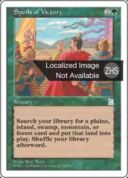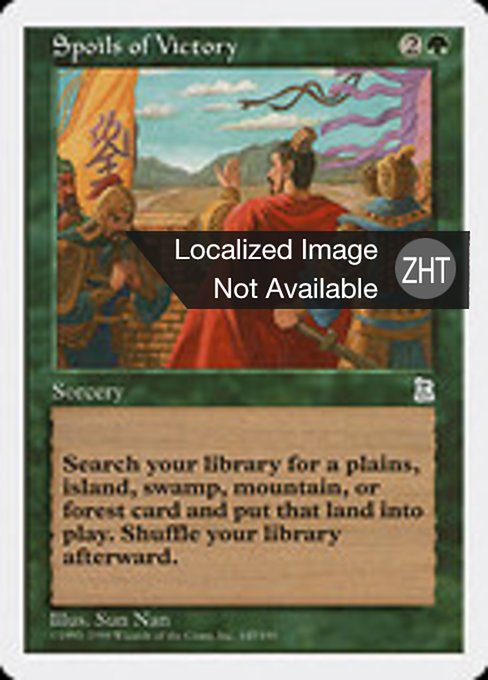 ![]() Variations— Parts— | Spoils of VictorySearch your library for a Plains, Island, Swamp, Mountain, or Forest card and put that card onto the battlefield. Then shuffle.