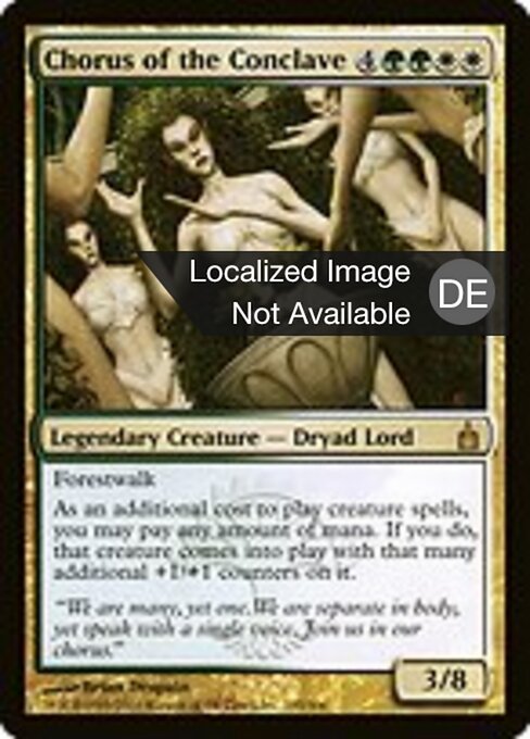 |  Variations— Parts— | Chorus of the Conclave3 / 8 Forestwalk (This creature can't be blocked as long as defending player controls a Forest.) As an additional cost to cast creature spells, you may pay any amount of mana. If you do, that creature enters with that many additional +1/+1 counters on it.