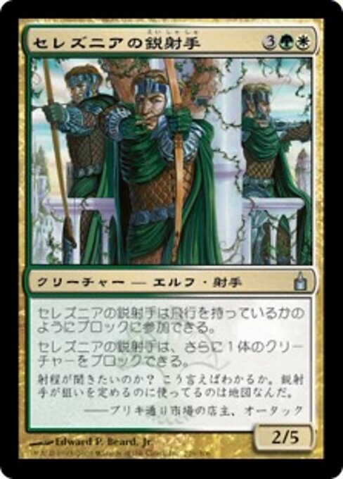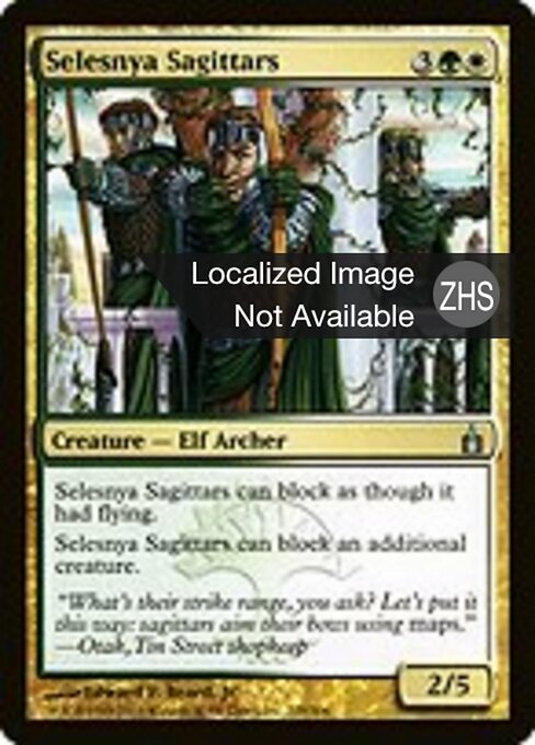 |  Variations— Parts— | Selesnya Sagittars2 / 5 Reach (This creature can block creatures with flying.) This creature can block an additional creature each combat.