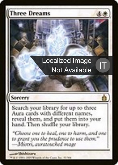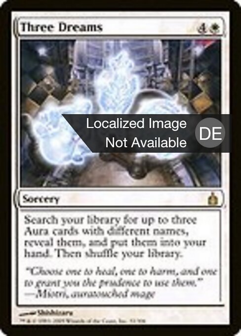 |  Variations— Parts— | Three DreamsSearch your library for up to three Aura cards with different names, reveal them, put them into your hand, then shuffle.