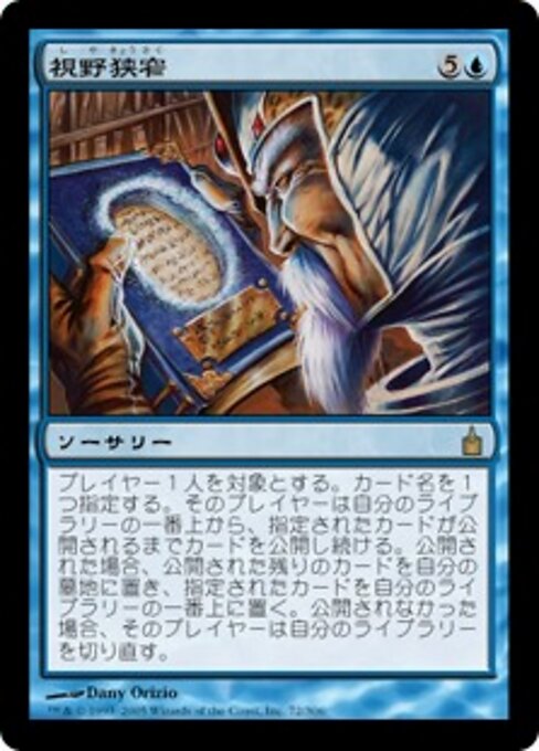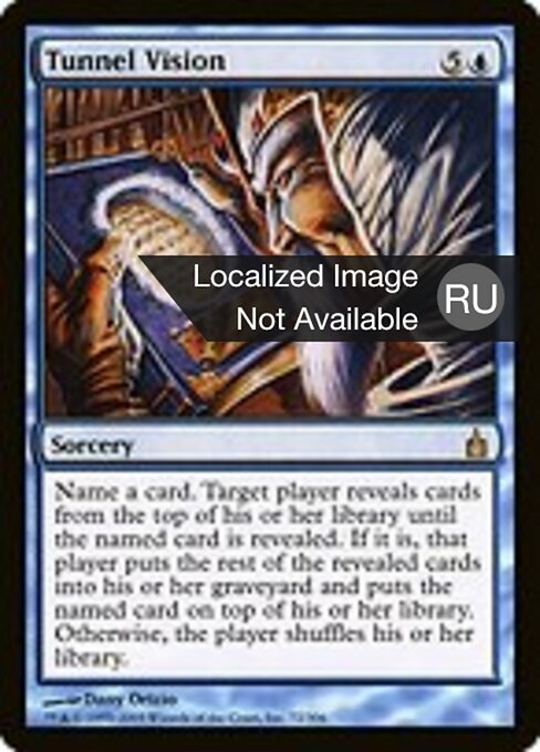 ![]() Variations— Parts— | Tunnel VisionChoose a card name. Target player reveals cards from the top of their library until a card with that name is revealed. If it is, that player puts the rest of the revealed cards into their graveyard and puts the card with the chosen name on top of their library. Otherwise, the player shuffles.