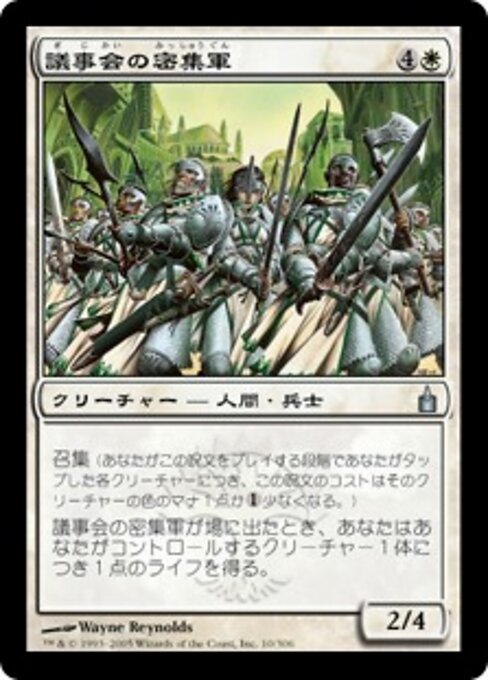 ![]() Variations— Parts— | Falange del Cónclave2 / 4 Convocar (Cada criatura que gires al jugar este hechizo reduce su coste en Cuando la Falange del Cónclave entre en juego, ganas 1 vida por cada criatura que controles.