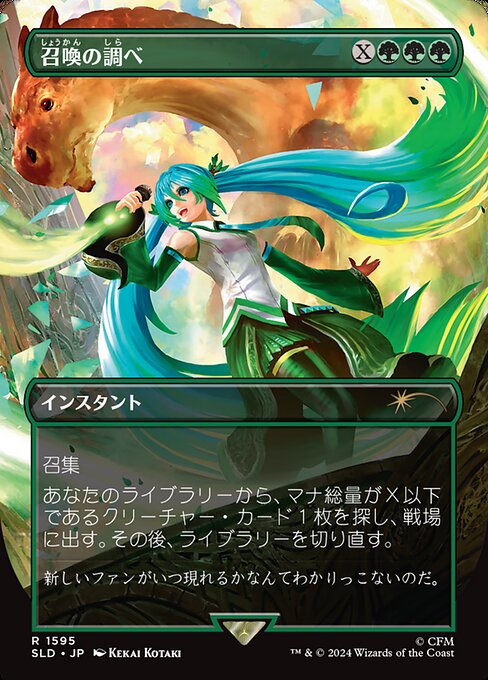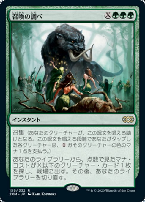 ![]() Variations— Parts— | 召喚の調べ召集 (あなたがこの呪文をプレイする段階であなたがタップした各クリーチャーにつき、この呪文のコストはそのクリーチャーの色のマナ1点か あなたのライブラリーから、点数で見たマナ・コストがX以下のクリーチャー・カードを1枚探し、それを場に出す。 その後あなたのライブラリーを切り直す。