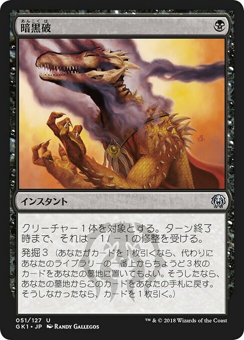 |  Variations— Parts— | 暗黒破クリーチャー1体を対象とする。それはターン終了時まで-1/-1の修整を受ける。 発掘 3 (あなたがカードを引く場合、代わりにあなたのライブラリーの一番上からちょうど3枚のカードをあなたの墓地においてもよい。 そうした場合、このカードをあなたの墓地からあなたの手札に戻す。 そうでない場合、カードを引く。)