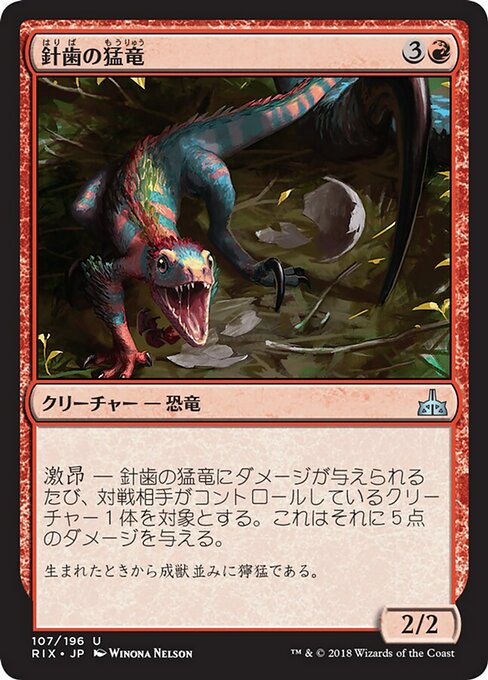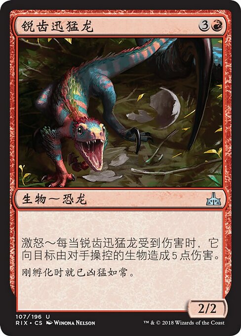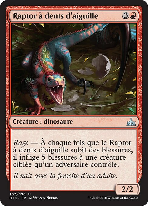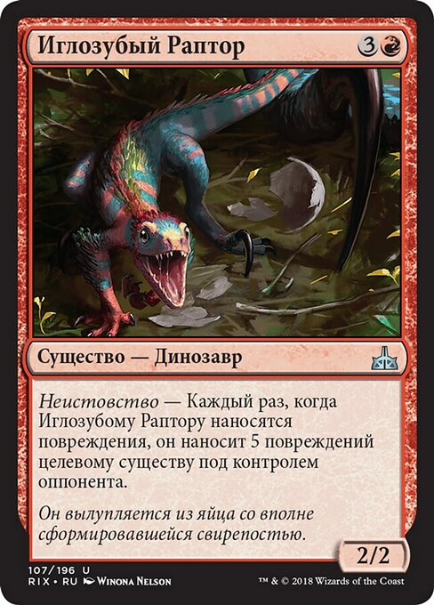 |  Variations— Parts— | Needletooth Raptor2 / 2 Enrage — Whenever this creature is dealt damage, it deals 5 damage to target creature an opponent controls.