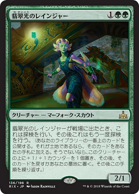|  Variations— Parts— | Jadelight Ranger2 / 1 When this creature enters, it explores, then it explores again. (Reveal the top card of your library. Put that card into your hand if it's a land. Otherwise, put a +1/+1 counter on this creature, then put the card back or put it into your graveyard. Then repeat this process.)