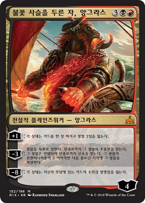 |  Variations— Parts— | Angrath, the Flame-Chained+1 : Each opponent discards a card and loses 2 life. −3 : Gain control of target creature until end of turn. Untap it. It gains haste until end of turn. Sacrifice it at the beginning of the next end step if it has mana value 3 or less. −8 : Each opponent loses life equal to the number of cards in their graveyard.