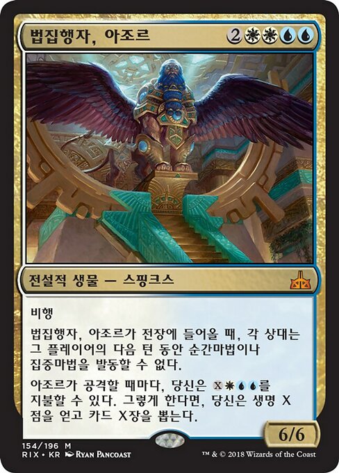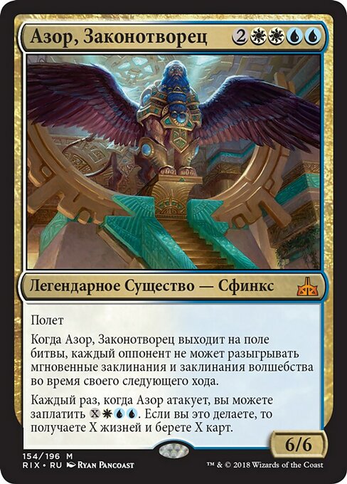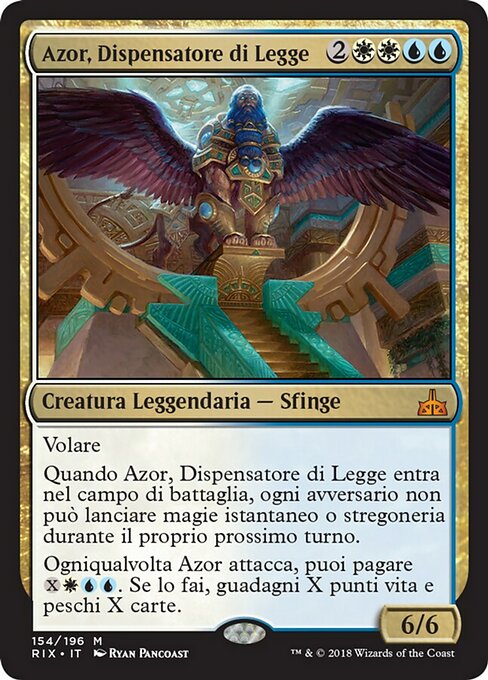 |  Variations— Parts— | Azor, the Lawbringer6 / 6 Flying When Azor enters, each opponent can't cast instant or sorcery spells during that player's next turn. Whenever Azor attacks, you may pay