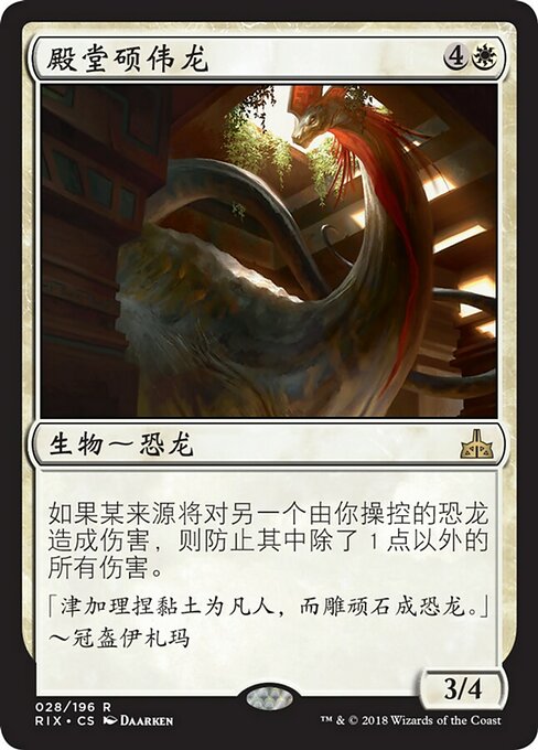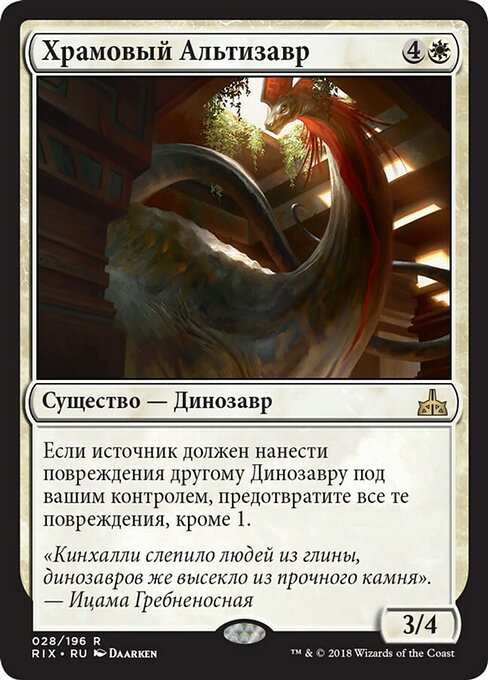 |  Variations— Parts— | Temple Altisaur3 / 4 If a source would deal damage to another Dinosaur you control, prevent all but 1 of that damage.