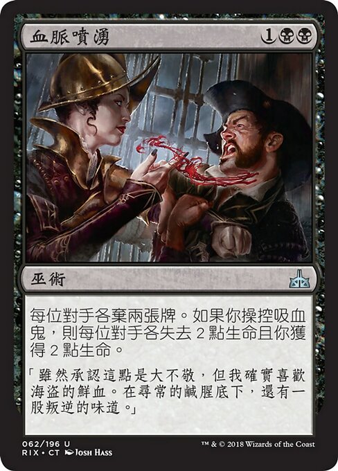 |  Variations— Parts— | Arterial FlowEach opponent discards two cards. If you control a Vampire, each opponent loses 2 life and you gain 2 life.