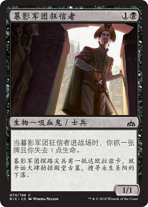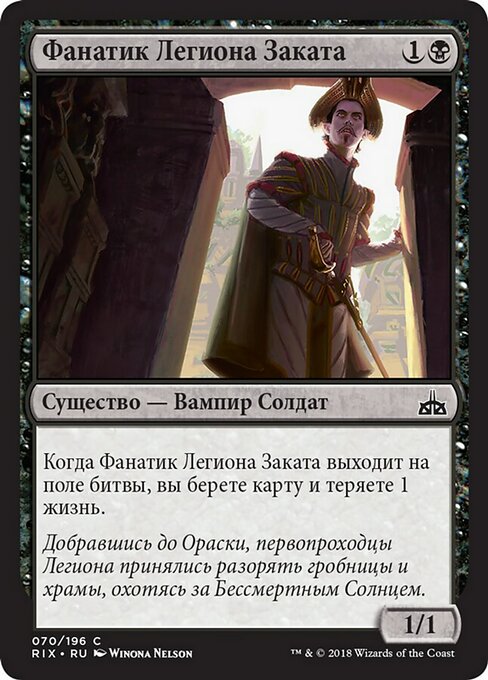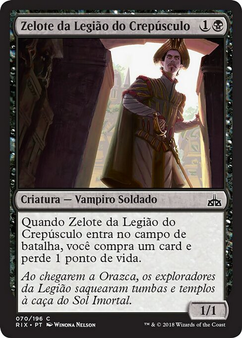 ![]() Variations— Parts— | Zelota della Legione del Vespro1 / 1 Quando lo Zelota della Legione del Vespro entra nel campo di battaglia, pesca una carta e perdi 1 punto vita.