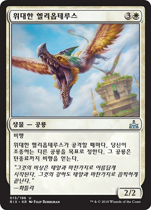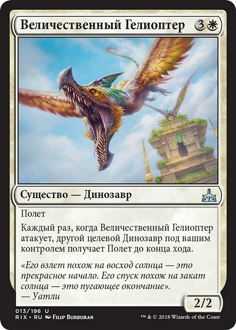 ![]() Variations— Parts— | Helióptero Majéstico2 / 2 Voar Toda vez que Helióptero Majéstico ataca, outro Dinossauro alvo que você controla ganha voar até o final do turno.