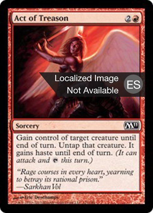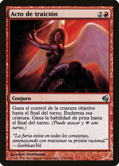 |  Variations— Parts— | Acto de traiciónGana el control de la criatura objetivo hasta el final del turno. Endereza esa criatura. Gana la habilidad de prisa hasta el final del turno.