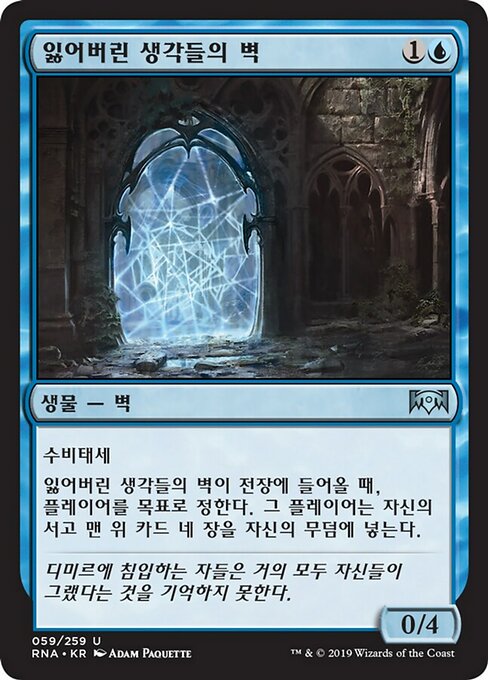 ![]() Variations— Parts— | 迷える思考の壁0 / 4 防衛 迷える思考の壁が戦場に出たとき、プレイヤー1人を対象とする。そのプレイヤーは自分のライブラリーの一番上からカードを4枚自分の墓地に置く。