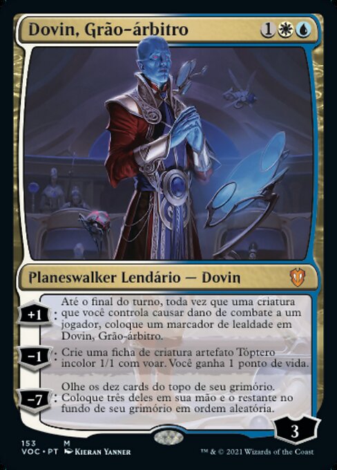 ![]() Variations— Parts— | Dovin, Grão-árbitro+1 : Até o final do turno, toda vez que uma criatura que você controla causar dano de combate a um jogador, coloque um marcador de lealdade em Dovin, Grão-árbitro. −1 : Crie uma ficha de criatura artefato incolor 1/1 do tipo Tóptero com voar. Você ganha 1 ponto de vida. −7 : Olhe os dez cards do topo de seu grimório. Coloque três deles em sua mão e o restante no fundo de seu grimório em ordem aleatória.